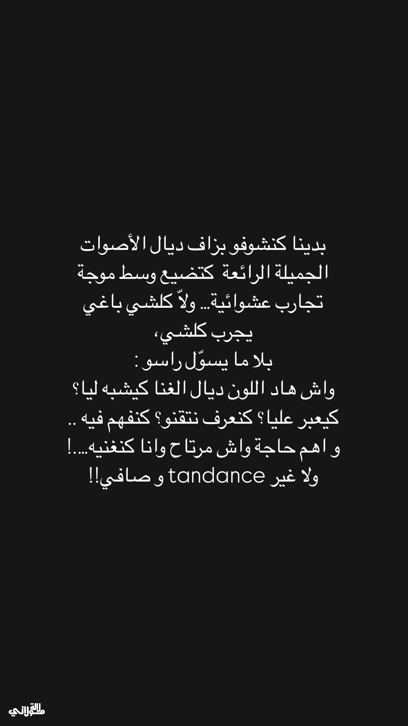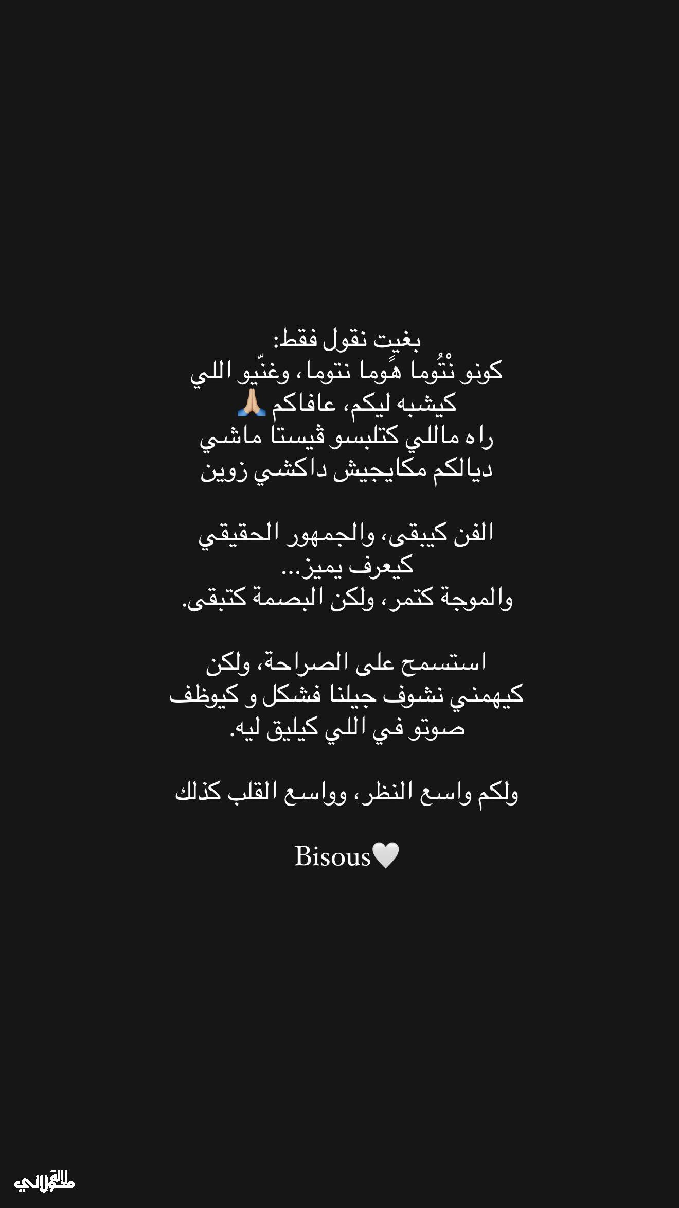 في خطوة نادرة، خرجت الفنانة المغربية إيمان الشميطي بتدوينات لافتة عبر حسابها الرسمي على منصة “إنستغرام”، عبرت من خلالها عن نظرتها العميقة تجاه واقع الفن والموسيقى، كما وجهت انتقادات مبطنة للمشهد الغنائي الحالي الذي تطغى عليه الفوضى والتقليد الأعمى.