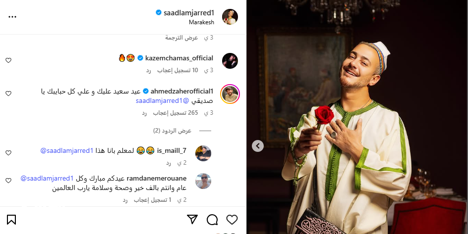 وتجدر الإشارة إلى أن لمجرد شارك متابعيه صورة جديدة نشرها خصيصا لمناسبة العيد، مرفقة بكلمات تهنئة لجمهوره العريض، وهو ما ساهم في خلق حالة من التفاعل المكثف، إذ تهاطلت عليه التعليقات من محبيه ومن زملائه في الوسط الفني، الذين حرصوا على مشاركته الأجواء الاحتفالية.
