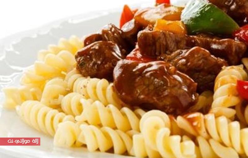 احضري طبق التقديم وضعي المعكرونة المسلوقة واسكبي في منتصفها خليط اللحم بالخضروات ثم قدّميها وزيّنيها بالبقدونس.