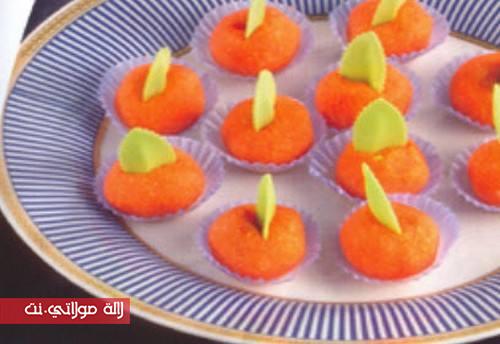 يكور العجين على شكل و قياس المشمشة تغرس فوقها ورقة الخضراء
