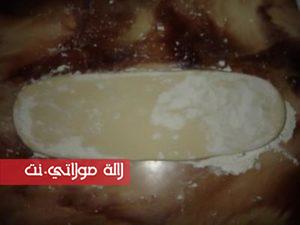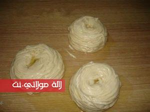 اتركي خيوط العجينة تسقط وسط طبق فيه زبدة وزيت.