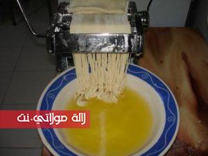 ضعي كل قطعة من العجينة المبسطة في آلة المعجنات ومررها للحصول على خيوط رقيقة كما في الصورة.