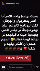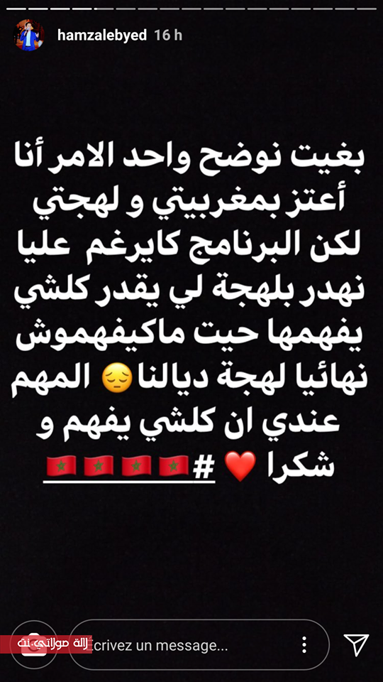 وقال حمزة عبر ستوري حسابه الرسمي على موقع التواصل الإجتماعي”إنستغرام” أنه يعتز بمغربيته ولهجته لكنه لا يتحدث بالدارجة لأن البرنامج يفرض عليه أن يتحدث بلهجة بيضاء لكي يفهمه الجميع لأنهم لا يفهمون لهجتنا وأضاف قائلا” المهم عندي أن كلشي يفهم شكرا”.
