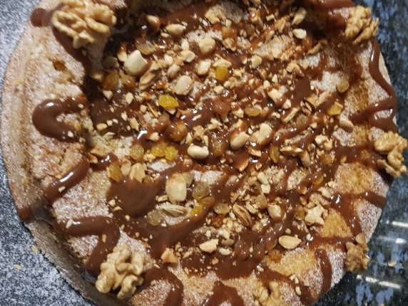 نخرج الحلوى من الفرن نتركها تبرد قليلا، ونقلبها في إناء التقديم، ونزينها بالكولي والفواكه الجافة.