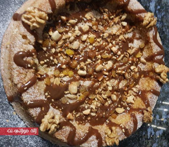 نأخذ المول العجيب ندهنه بالزبدة ونرشه بسنيدة عوض الدقيق، في الوسط نضع اللوز المكسور ونستف عليه شرائح التفاح.