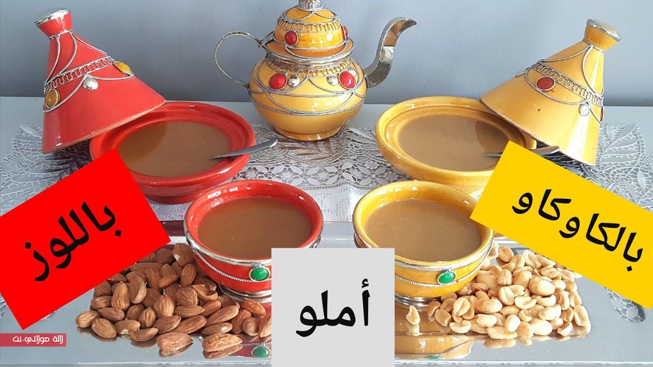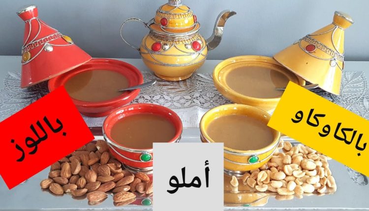 يحمر في الفرن اللوز والكوكاو حتى يصبح لونه ذهبيا ثم يطحن في الخلاط الكهربائي أو رحى.