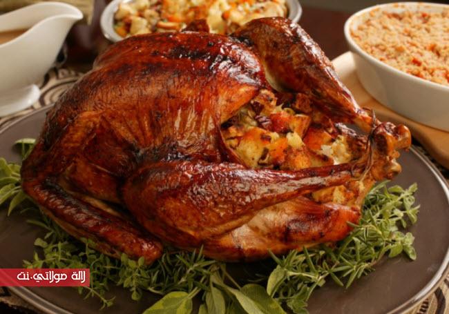 في ايناء أخلطي الزبدة ، الخردل ، التوابل ، ثم تبلي الدجاجة بالخليط و املئي لبها الحشو المحظر .