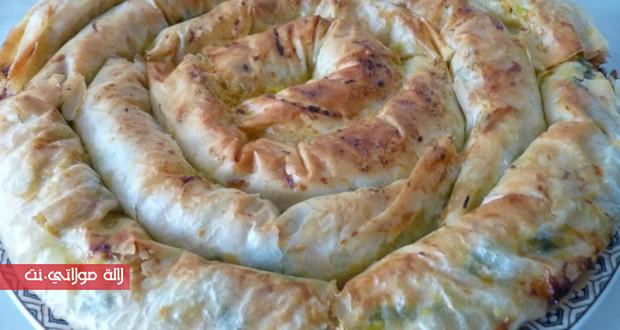 ثم نلفّ العجين حول الحشوة ديالنا ونلفه على شكل حلزوني كما هو واضح أسفله