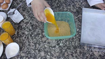 نضع البسكويت المطحون مع الزبدة الدائبة ونخلطهم