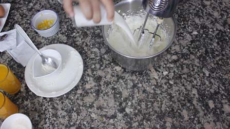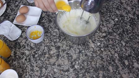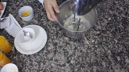 نأخد الجبن نضعه في اناء ونضيف له سكرالخشن ونطربه بعد ذالك نضيف له القشدة الطرية ومسحوق الفانيلا وبيض ومبشور البرتقال