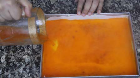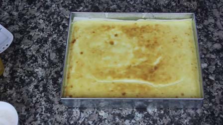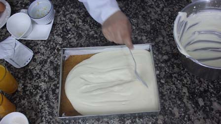 نأخد الخليط ونفرغه فوق الطبقة الاولى وندخله الفرن ويجب ان تكون النار من فوقه