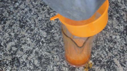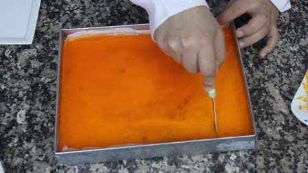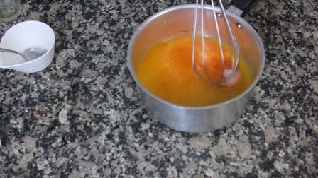 نفرغ عصير البرتقال في اناء ونضيف له السكر وفلان ومسحوق الفانيلا ثم نضعه فوق النار