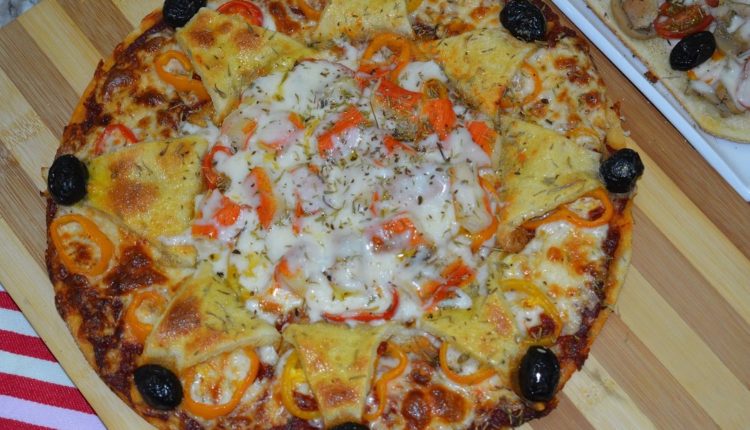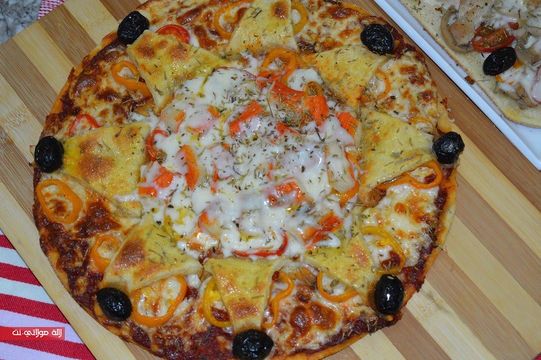 على نار هادئة نضع ضرس ثوم + القليل من الزيت حتى يتحمر، ثم نضيف طماطم وتطبخ ونضيف فلفل أحمر وأخضر مشوي منزوع القشرة ونضيف ملح وفلفل اسود، بابريكا وكامون وبعدها نطحنها. ثم نضع التكتوكه على البيتزا ونضيف الخضر المشويه ثم زيتون الأسود و الجبن بانواعه ثم الى الفرن