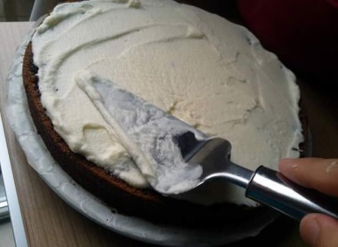 نحيدو لو الجهة الفوقانية ، نسقيوه بواحد دانيت اكنديرو عليه 200مل قشدة نطربها مع 3معالق ديال السكر حتى تولي كريم.