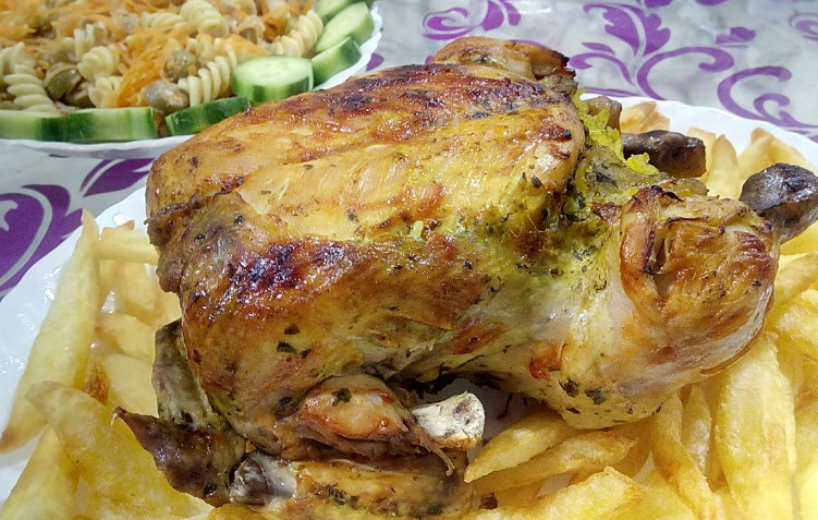 تخلط كل مكونات الشرمولة مع التوابل بعد ان تتجانس كل المكونات ندهن الدجاجة جيدا ونتركها لتتشرب الشرمولة