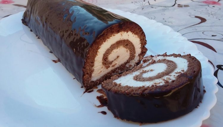 نفتح البسكويت الملفوف ونضع ثلثي الكريما، ونلفها ونتركها تبرد لمدة ساعة، بعدها نذهن بالكمية المتبقية من الكريما الحلوى الملفوفة، ونزيل الجوانب لإظهار شكل الحلوى الدائري، ونتركها تبرد لمدة ساعة. نضيف بعد ذلك بودرة الكاكاو ونزينها بالطريقة المبينة في الصورة.