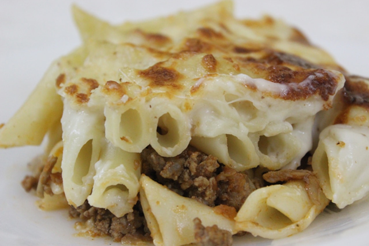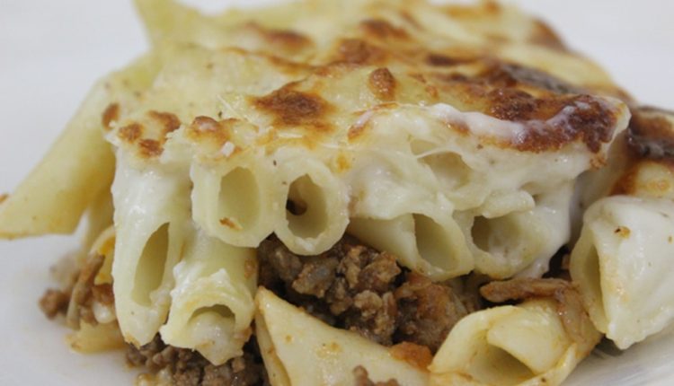 ضعي طبقة اللحمة بعد ذلك ومن ثم افردي طبقة المعكرونة المتبقية ثم اسكبي البشاميل.