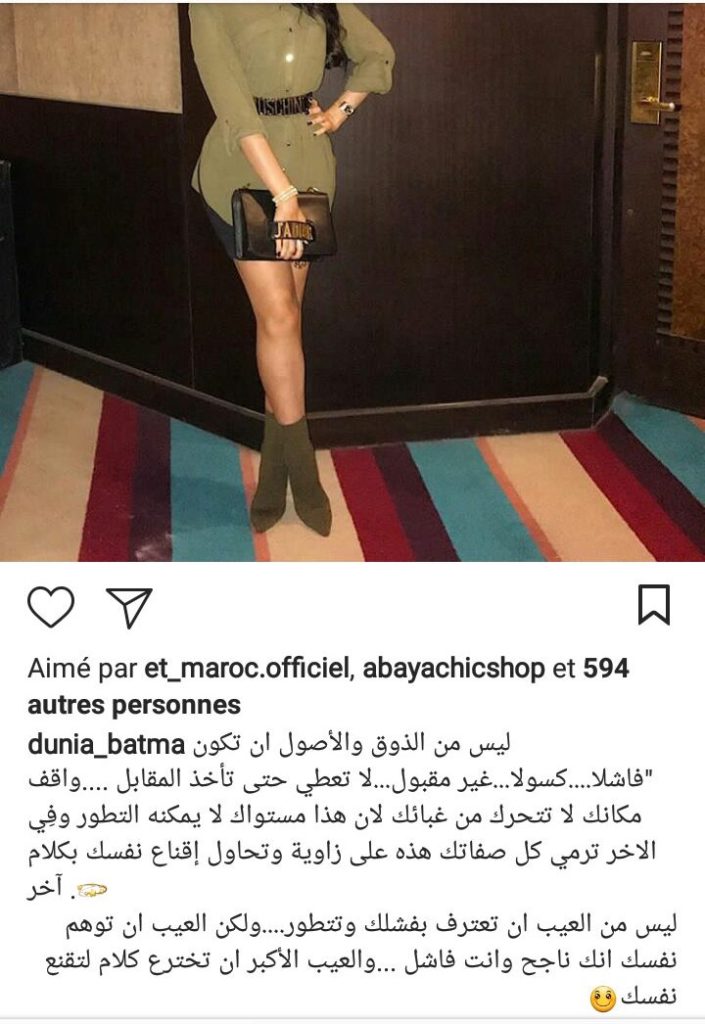 وجهت المطربة المغربية دنيا بطمة رسالة لشخص مجهول عبر حسابها الشخصي على “انستغرام” ناعتة إياه بالفاشل وناصحة له بالاعتراف بفشله لكي يطور من نفسه.