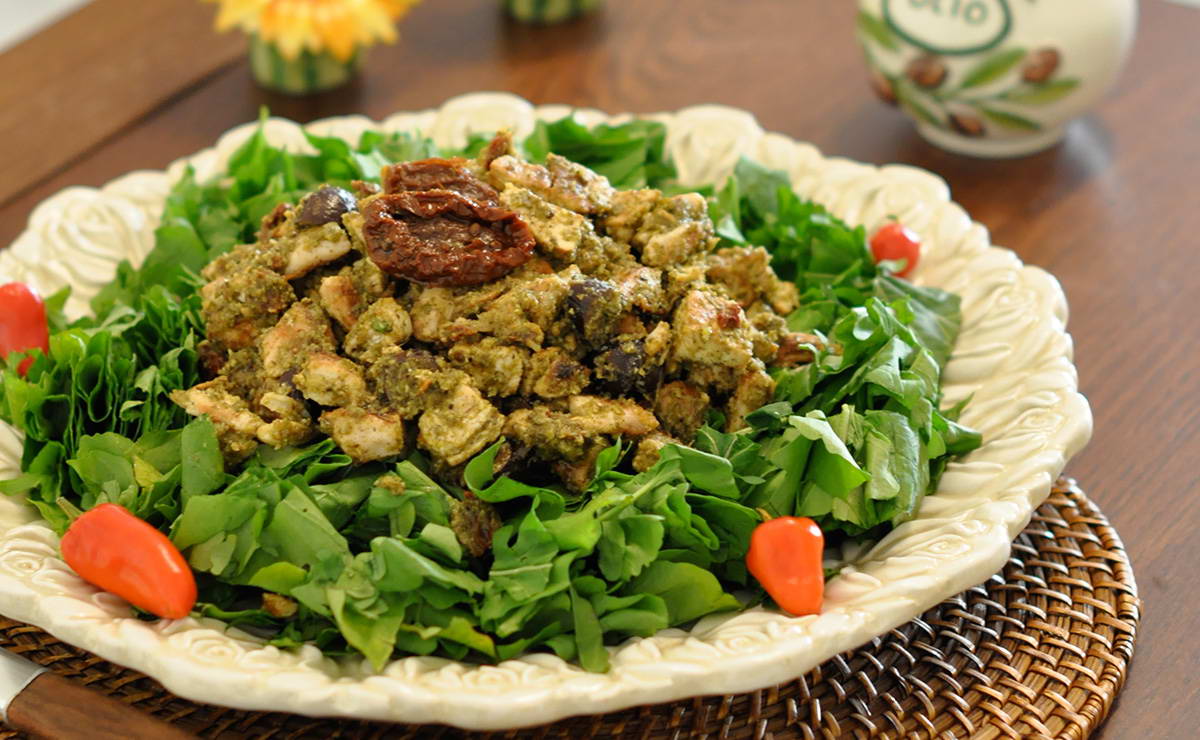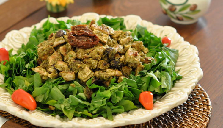 – في نفس المقلاة نطهو اللوبيا الخضراء حتى تصبح طرية وهشة. نضيف شرائح الدجاج إلى المقلاة، ثم تضاف الطماطم والبيستو. يقلب الخليط حتى يدمج بشكل كامل.