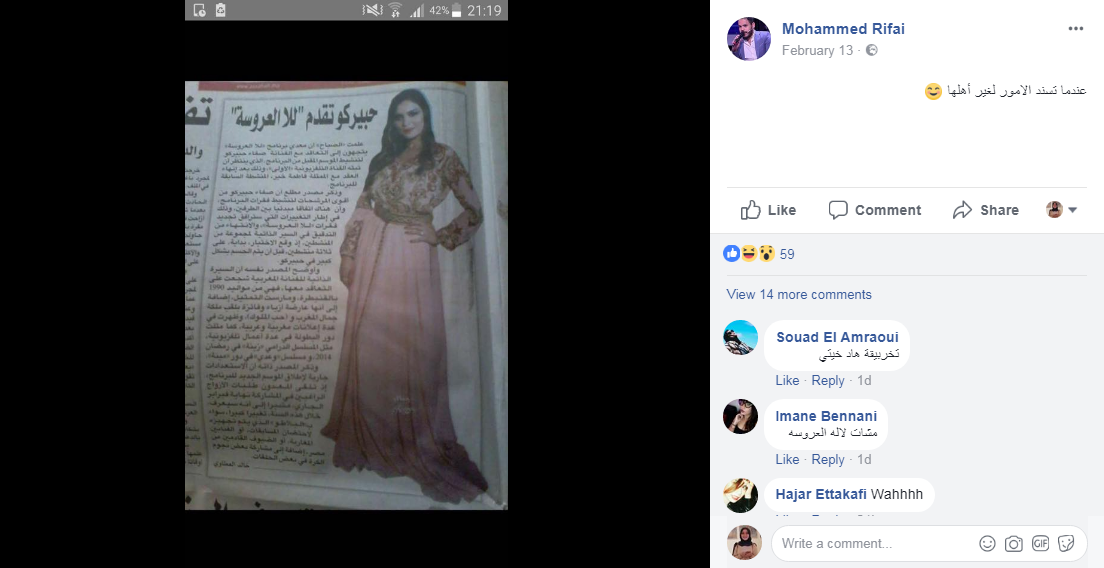 وأعرب “الرفاعي” عن عدم أهلية الممثلة “حبيركو” في خلافة فاطمة خير وتقديمها لبرنامج “لالة العروسة”، حيث قال في تدوينة أرفقها بمقال ل “حبيركو” “عندما تسند الأمور لغير أهلها”.