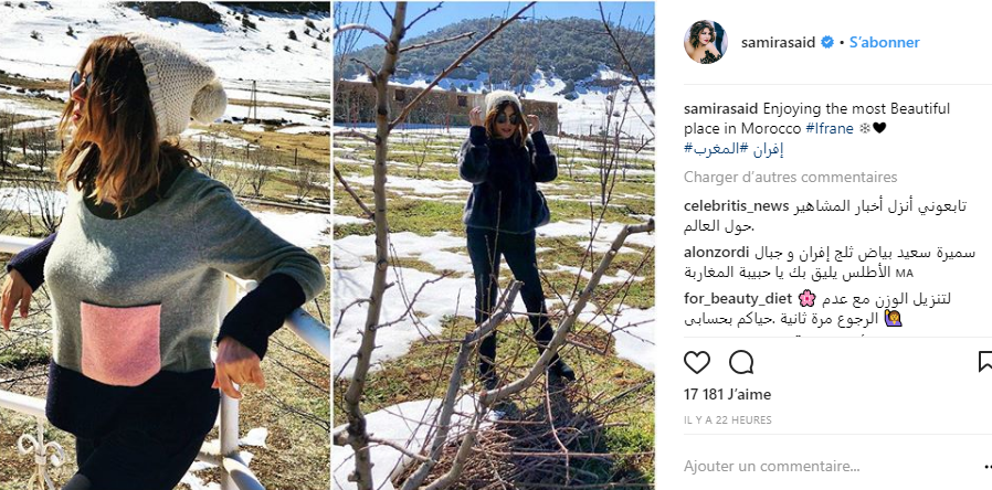 نشرت الفنانة المغربية سميرة سعيد عبر حسابها الرسمي على موقع التواصل الاجتماعي انستغرام صورا من رحلتها الأخيرة بمدينة إفران، حيث بدت فيها مستمتعة بمنظر الثلوج، بإطلالة شبابية أنيقة.