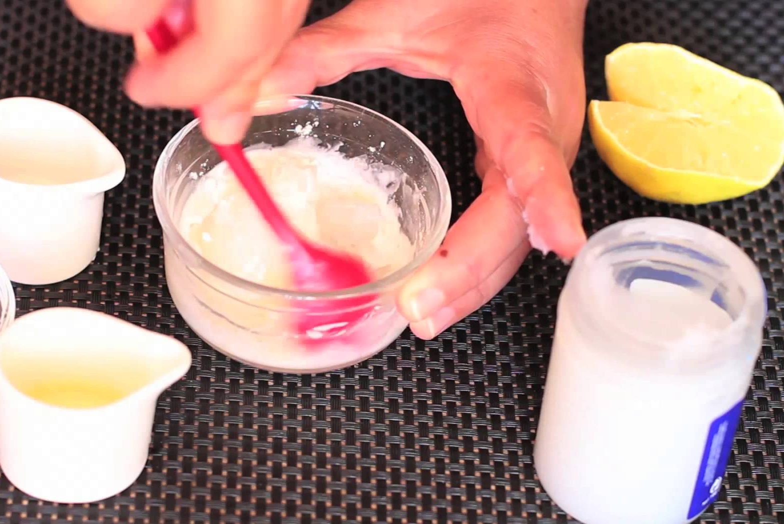 نمزج المكونات كلها حتى نحصل على خليط متجانس ثم نضعه على اليدين ونتركه لعدة دقائق بعد ذلك نشطفه بالماء الفاتر، تكرر هذه العملية بانتظام للحصول على نتيجة رائعة و مبهرة.
