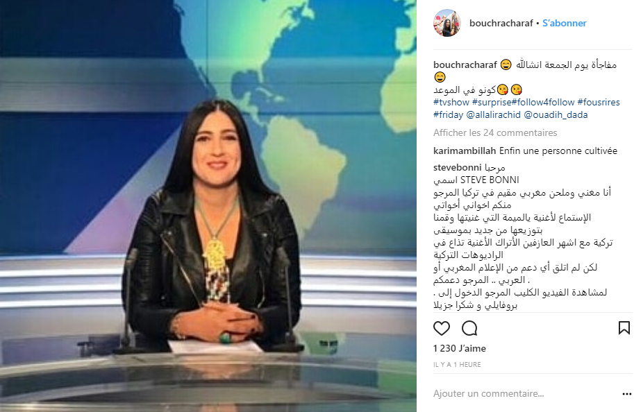 بعد غياب دام لسنوات طويلة واختفائها عن الشاشة شرت مقدمة برامج الأطفال السابقة بشرى شرف صورة عبر حسابها الرسمي على موقع التواصل انستغرام وهي تقدم نشرة الأخبار على القناة المغربية الثانية،وعلقت عليها بالقول:” مفاجأة يوم الجمعة إن شاء الله ” .