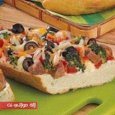 الخاصة لعمل الصوص الخاص بالبيتزا وتقطع الخبز الفرنسي الى اربع اقسام وتقطع من النصف الاخر ( جهة وحدة فقط ) وتدهن فوق الخبز المكونات الصوص وبعد ذلك وضع الدجاج و الجبنة والزيتون .