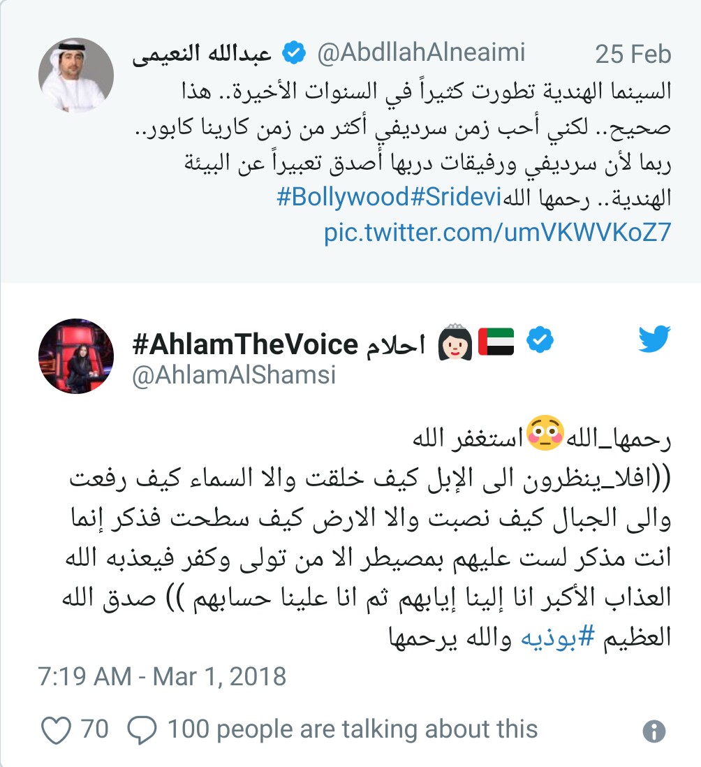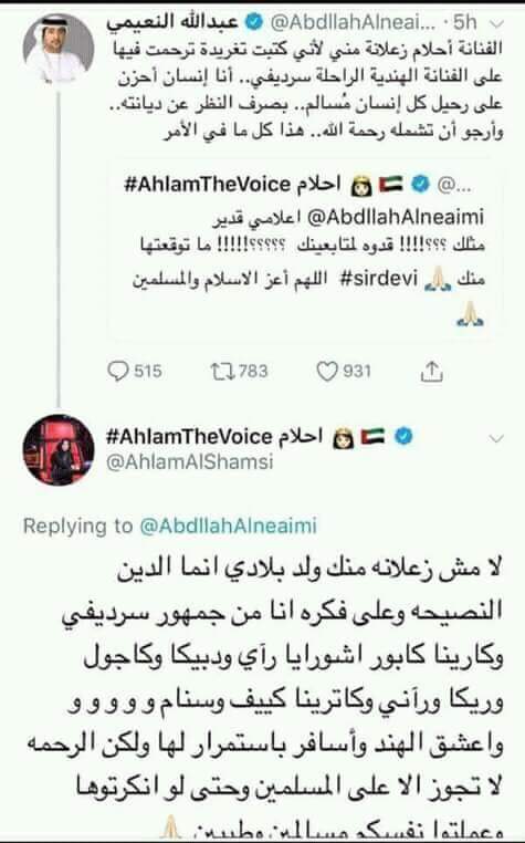 تناقل رواد مواقع التواصل الاجتماعي تغريدة مثيرة للجدل للفنانة أحلام، حول وفاة النجمة الهندية سرديفي كابور على حسابها في “تويتر” بعنوان: “رحمها الله.. أستغفر الله” والتي ترى أنه “لا يجوز الترحم عليها”، لأنها بوذية واستدلت على ذلك بآية من القرآن الكريم.