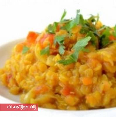 ضع الماء في قدر ثم أضف العدس ودعه يغلي على نار قوية ، ثم خففها وغط الطنجرة. اترك العدس حتى يقارب النضج ويجف الماء (أي مدة 30 دقيقة).