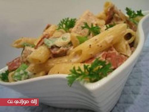 أضف قطع الدجاج إلى صلصة الكريما و اسكبها فوق المعكرونة المسلوقة.