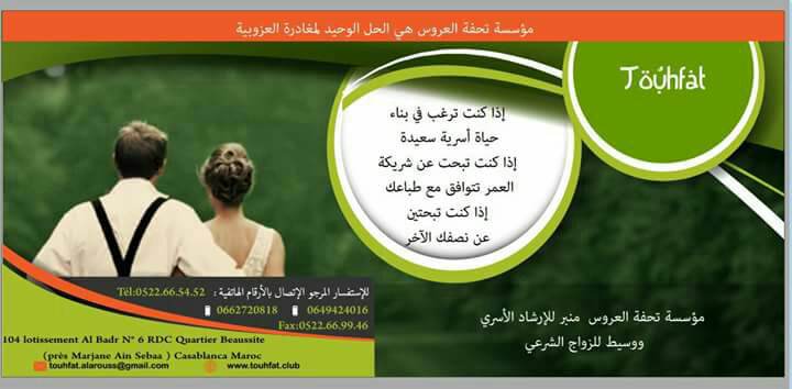 تحفة العروس..وكالة خاصة بالوساطة في الزواج استطاعت تزويج أكثر من 80 حالة اخبار On مارس 12, 2018 شارك 1 2 3 شارك FacebookWhatsAppPinterest