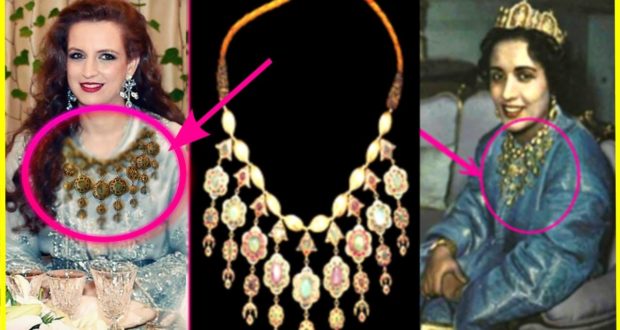 ولكن القطعة المميزة التي لفتت انتباه الجميع، هي والتي لا تفارقها حيث ترتديها في عدة إطلالات لا سيما المقامة داخل القصر الملكي هو العقد الذي تزيين به رقبتها في إطلالتها، وهو عقد سبق وأن ارتدته في العديد من المناسبات الرسمية هو نفس العقد الذي يظهر في صورة للأميرة الراحلة لالة فاطمة الزهراء أخت الملك الراحل الحسن الثاني وعمة الملك محمد السادس.