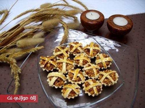 نخلط في اناء الزبدة والسكر كلاصي كويس حتى يصير مثل الكريما ونضيف البيض والدقيق شيئا فشيئا ونحصل على عجينة لينة نسرحها بالمدلاك للحصول على سمك رقيق ونقطعوه بكأس صغير شكل دائري وندهن قوالب الحلوى بالزيت ونثبت فيهم العجينة ونتخلص من العجين الزائد في الجوانب ونتقبهم بشوكة لكي لا ينتفخ العجين ونملؤوهم بالحشوة الي جهزناها من قبل ونقطع شرائح رقيقة من العجين بالناعورة (القطاعة المسننة ) ونزوق بيهم فوق السليلات بشكل معاكس كما في الصورة وندهنهم بصفار البيض ونرتبوهم في صفيحة الفرن وندخلوهم ينضجوا على درجة حرارة معتدلة لغاية ما نحصل على لون دهبي وننزع القوالب من الحلوى ونقدمها