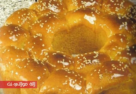 مرة ثانية وتدهن بالبيض وتطهى في فرن ساخن . بعد ذلك تذهن بالمربى أو النباج وترش بالزنجلان