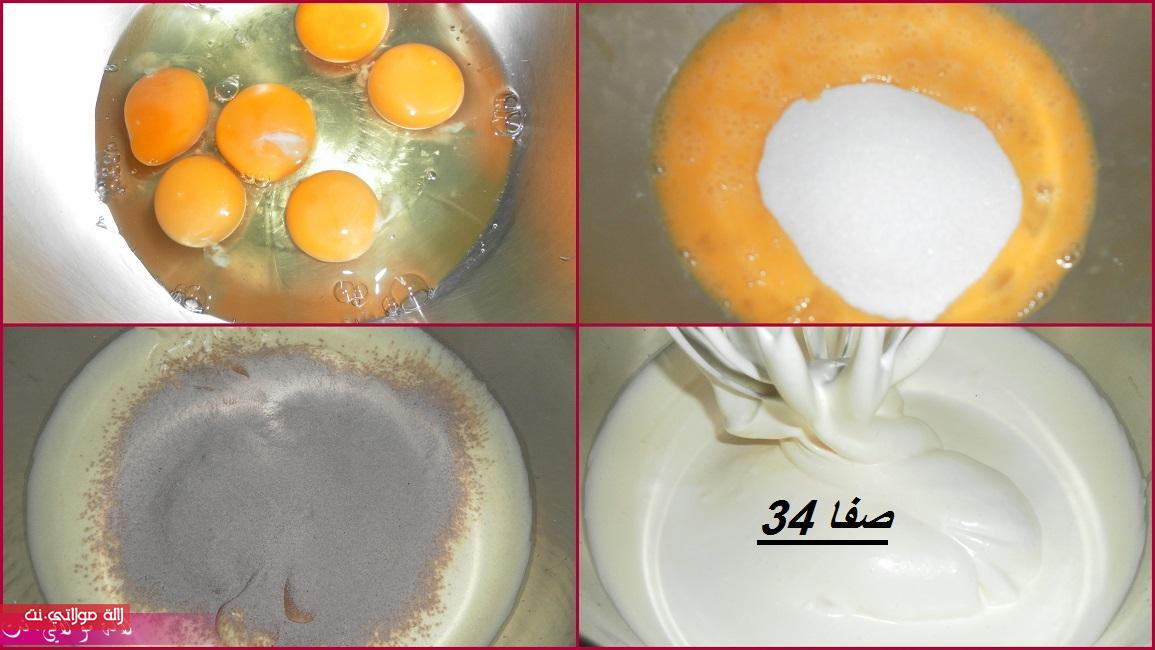 نطربو البيض و السكرو الفانيلا مدة 10 دقايق ثم نضيف الدقيق و الكاكاو مغربل مزيان من قبل