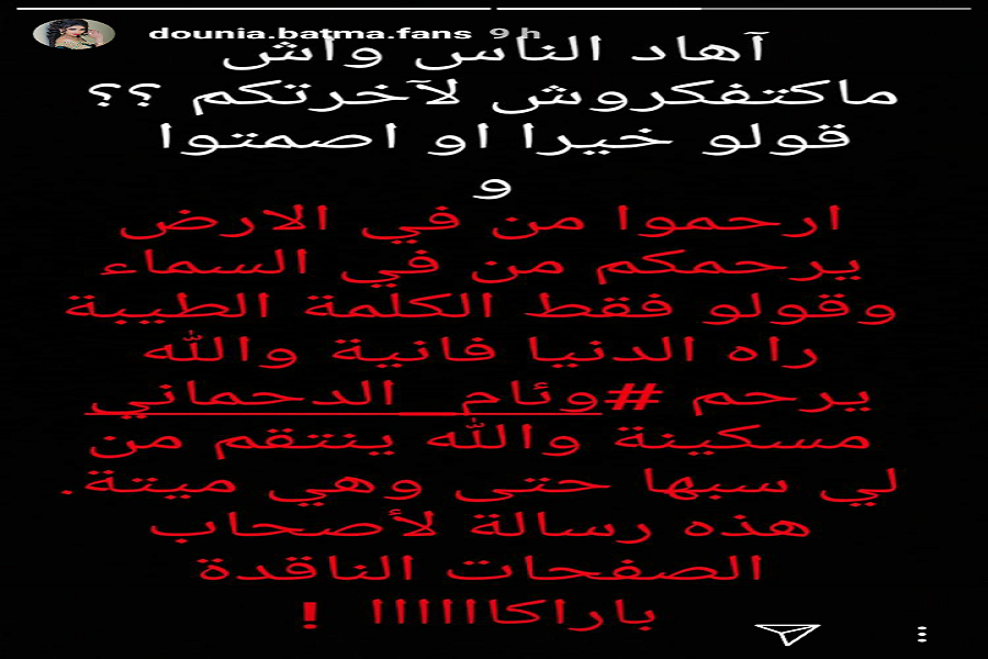 دنيا باطمة قالت عبر ستوري نشرته عى صفحتها على إنستغرام، : » أهاد الناس واش ماكتفكروش لأخرتكم قولوا خيرا أو اصموتوا، وئام الدحماني الله يرحمها مسكينة والله ينتقم من لي سبها وهي ميتة ».