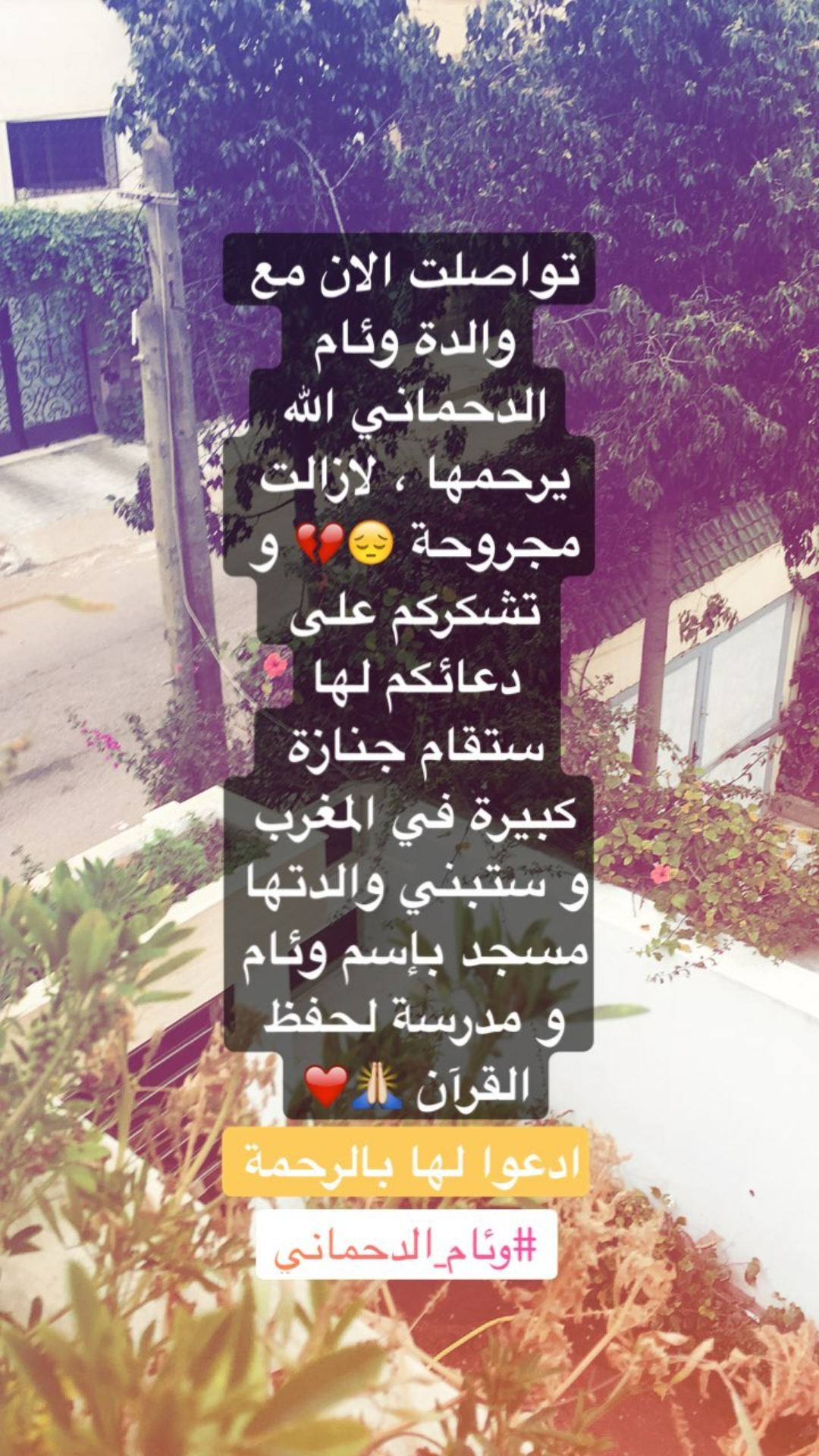 ونشر الهاشمي في حسابه على “انستغرام”، تفاصيل الحوار الذي دار بينه وبين والدة وئام الدحماني، وقال: “تواصلت الآن مع والدة وئام الدحماني الله يرحمها، لازالت مجروحة، وتشكركم على دعائكم لها، ستقام جنازة كبيرة في المغرب وستبني والدتها مسجد بإسم وئام ومدرسة لحفظ القرآن، ادعوا لها بالرحمة”.