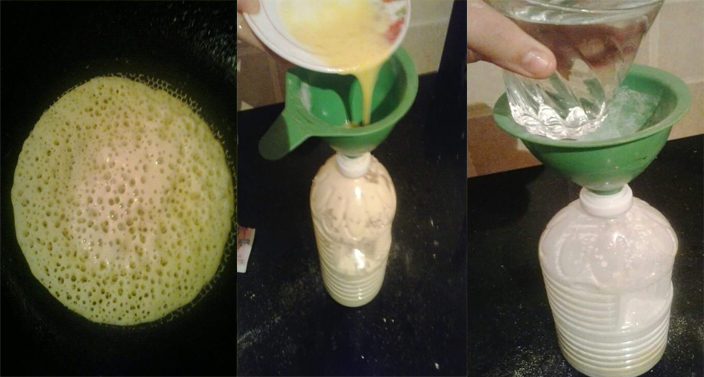 قومي بخلط المواد الجافة مع بعضها في المرحلة الأولى، ثم أضيفي الماء شيئا فشيئا ثم صبي الخليط في قنينة بلاستيكية واخلطي جيدا ثم أغلقي القنينة واتركيها 15 دقيقة إلى أن تختمر ، ثم ضعي المقلاة على النار إلى أن تسخن ثم امسحيها بقطعة إسفنجية فيها القليل من الزبدة ثم افتحي فتحة القنينة وصبي القليل من البغرير وأغلقي القنينة مرة أخرى وهكذا إلى أن تنتهي من الكمية، فهذه الطريقة تجعل البغرير مثقب.