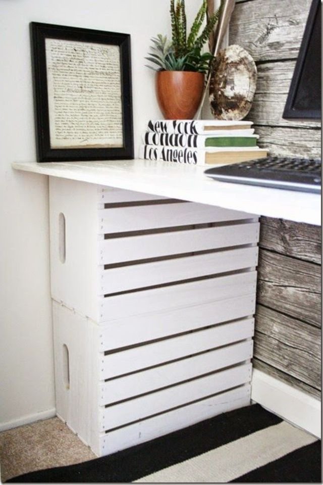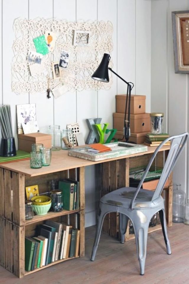 من الأفكار الأخرى التي يمكنك تنفيذها لإعادة استخدام الصناديق الخشبية في ديكور المنزل هو تحويلها إلى مكتب ولكنك في هذه الحالة ستحتاجين إلى مطرقة ومسامير، فهل تحتاجين المزيد من الأفكار؟ كل ما عليك فعله الآن هو مشاهدة الصور التالية لتتعرفي على هذه الطرق المختلفة لإعادة استخدام الصناديق الخشبية في ديكور منزلك.