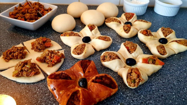 400غ دقيق ما يعادل 3 كيسان ونصف بعبار كاس العنبة/نصف كاس زيت بقياس كاس العنبة/ملعقة صغيرة ملح/ملعقة صغيرة سكر/ملعقة كبيرة خميرة الخبز/والحليب لجمع العجين تقريبا 100م