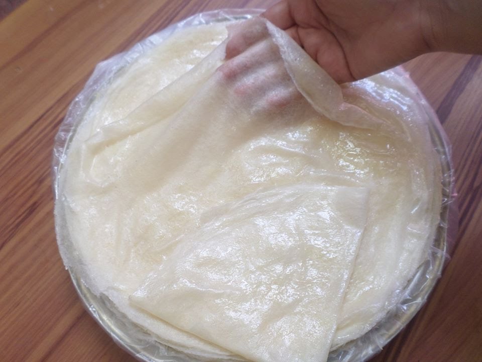 حضري كامل قطع العجين بنفس الطرقة، ثم ضعي بين كل رقاقة والأخرى رشة نشا، ثم ضعي الرقاقة الأخرى فوقها ورشّي النشا وهكذا حتى تنتهي كامل الكمية. افردي العجينة مرّة أخرى وهي على شكل طبقات بالنشابة حتى تحصلي على رقاقات جيدة، ثمّ قومي بفصلها عن بعضها البعض، ويمكن استعمالها مباشرةً في تحضير الأطباق أو حفظها في مجمّد الثلاجة عن طريق تغليفها بكيس بلاستيكي جاف ونظيف.