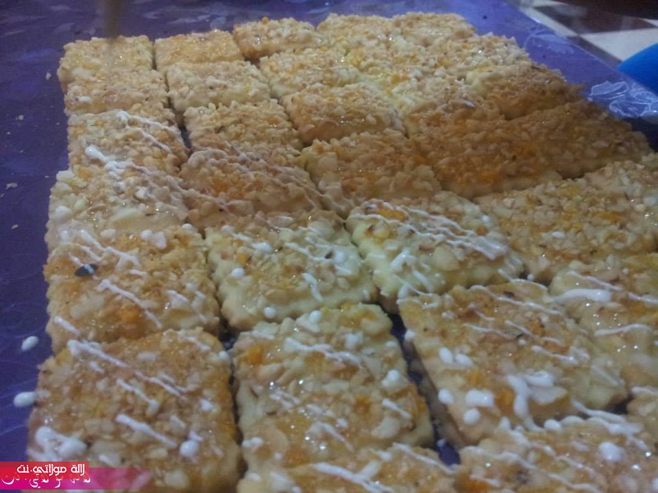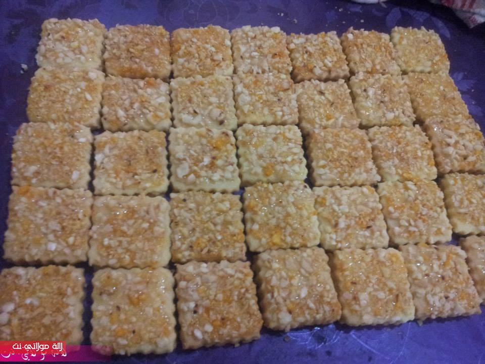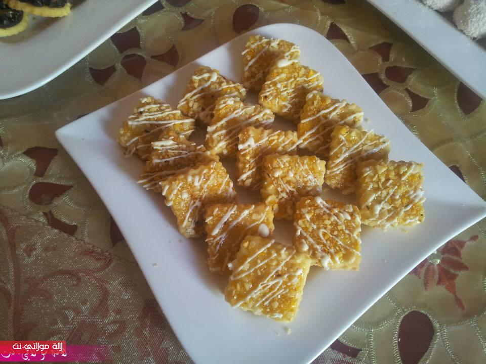 الطريقة :كنخدموا الزبدة مع السكر ونزيد الزيت ولكريم باتسيير وفلان و روح الخوخ ونجمعوا بالطحين وندخلوها بين جوج بلاستيكات ونطبعوها بالطابع مربع وندخلوه لفران يطيب ملي يبرد ندوبو شوية اكليكوز مع الناباج و نلصقو به الصابلي و ندهنوه من الفوق و نديرو داك اللوز المنسم بروح الخوخ و نزينو بخطوط الشكلاط الابيض