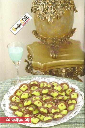 يطحن اللوز مع السكر, يضاف الفدندو وروح الفستق و الملون الأخضر ثم بياض البيضة ويخلط الكل جيدا .يعمل من الخليط كوبرات صغيرة تدخل وسط قالب معدني لتأخذ شكله ثم نخرج من القالب و توضع وسط السكر سنيدة لتنفيذ و توضع وسط كواغط الحلوى تزين بنقطة من الشوكولا المذابة مع زيت الزيتون وتقدم.