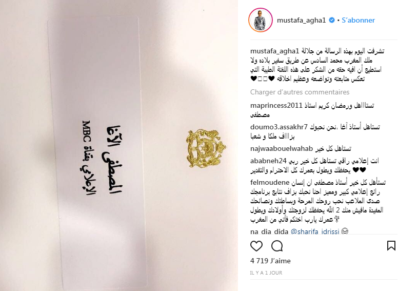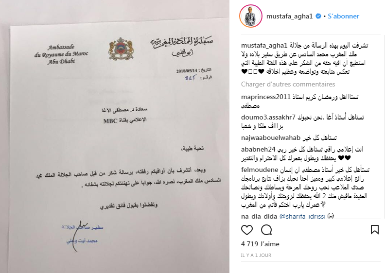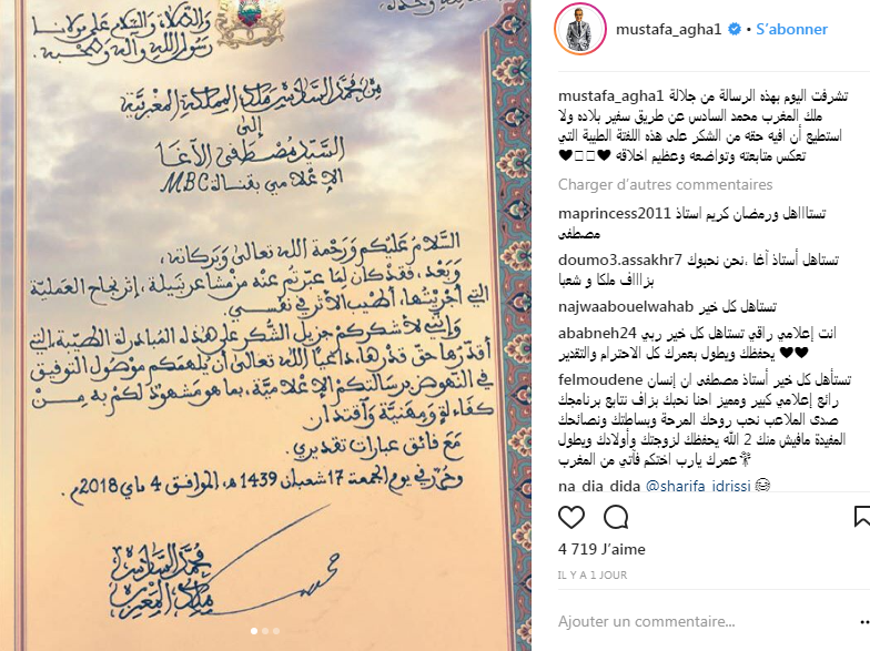 شر مقدم برنامج صدى الملاعب في قناة ام بي سي الفلسطيني مصطفى الأغا، صورة للرسالة الخطية التي وجهها له الملك محمد السادس، تعبيرا منه عن الشكر والامتنان ”.