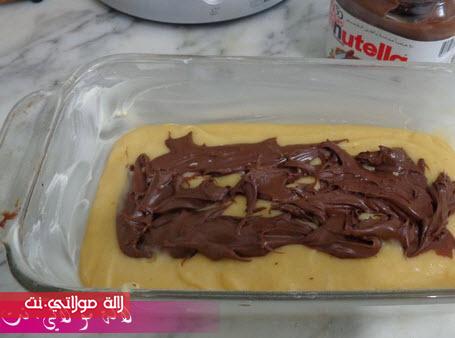 بعد ذلك قمت بسكب نوتيلا وأعدت الكيك للفرن مدة 30 دقيقة
