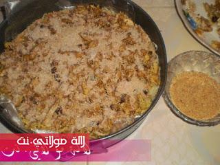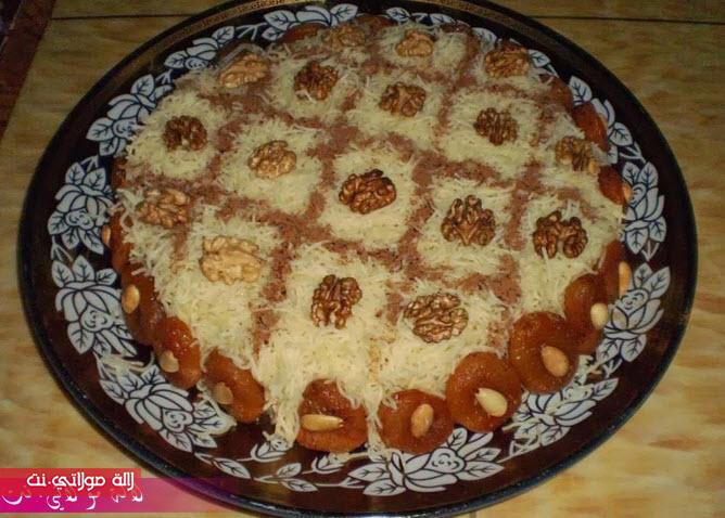 ونقلبها في صحن التقديم وتزين بالمشمش المعسل والكركاع ان كان متوفرا او اللوز وتزين بالقرفة ويمكن تزينو على حسب الرغبة