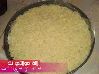 نأخد صينية التشيز كيك او صينية عادية خاصة بالكيك تكون دائرية ونلبسها بلاستيك غدائي ونضع طبقة من شعرية السفة المبخرة