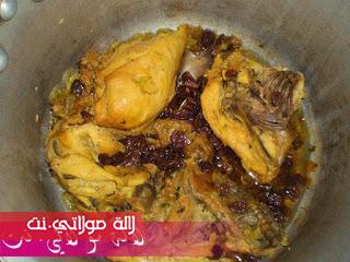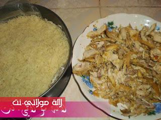 وبعد النضج نقوم بازالة الدجاج ونزيل عنه العظم ويوضع في طبق جانبا مع مرقه