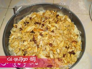 دجاجة مقطعة + 2 بصلتان من حجم كبير مفرومين +الزبيب+ توابل( ملح+فلفل اسود+ زعفران+ قرفة )